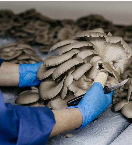 Als de paddenstoelen volgroeid zijn, worden ze voorzichtig geplukt en worden ze door de pluksters in de door de klant gewenste verpakking gedaan. Daarna worden ze gekoeld in afwachting van het transport.